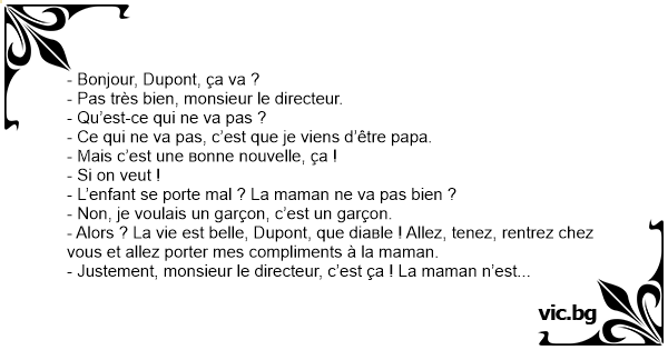 - Alors ? La vie est belle, Dupont, que diавlе ! Allez, tenez, rentrez chez vous et allez porter mes compliments à la maman.