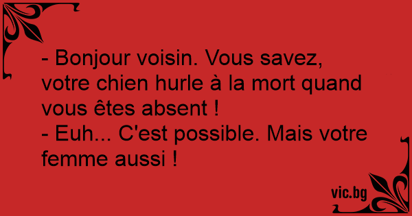 - Bonjour voisin. Vous savez, votre chien hurle à la mort quand vous êtes absent !