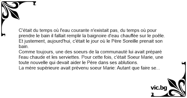La mère supérieure avait prévenu soeur Marie: Autant que faire se peut, il ne faut pas regarder le Père Soreille lorsqu'il est tout nu, et aussi, il faut faire ce que demande le Père Soreille et prier...