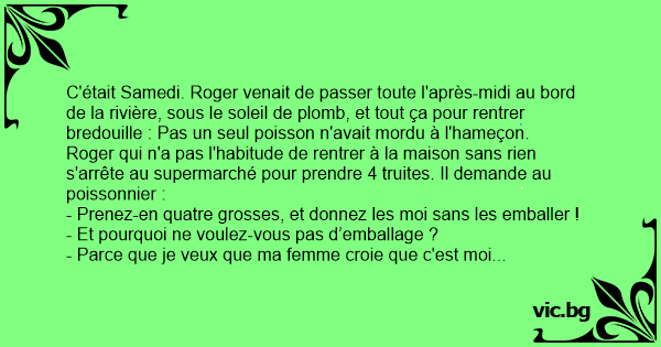 Roger qui n'a pas l'habitude de rentrer à la maison sans rien s'arrête au supermarché pour prendre 4 truites. Il demande au poissonnier :