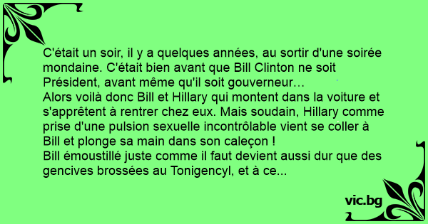 Alors voilà donc Bill et Hillary qui montent dans la voiture et s'apprêtent à rentrer chez eux. Mais soudain, Hillary comme prise d'une pulsion sexuelle incontrôlable vient se coller à Bill et plonge sa main dans son caleçon !