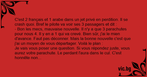 C'est 2 français et 1 arabe dans un jet privé en perdition. Il se crash quoi. Bref le pilote va voir ses 3 passagers et dit :