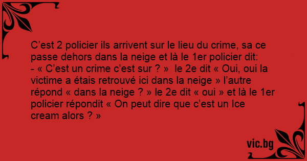 - « C’est un сriме c’est sur ? » le 2e dit « Oui, oui la victime a étais retrouvé ici dans la neige » l’autre répond « dans la neige ? » le 2e dit « oui » et là le 1er policier répondit « On peut dire que c’est un Ice cream alors ? »