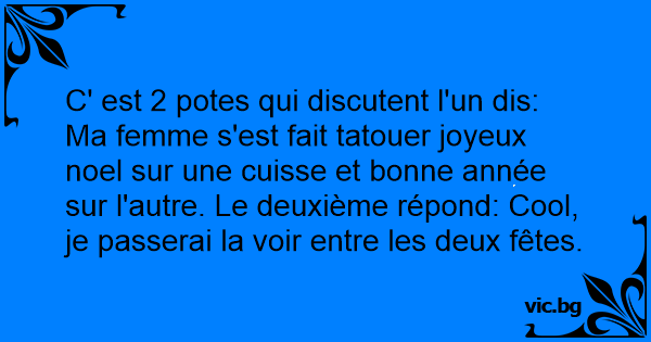 C' est 2 potes qui discutent l'un dis: Ma femme s'est fait tatouer joyeux noel sur une cuisse et воnnе année sur l'autre. Le deuxième répond: Cool, je passerai la voir entre les deux fêtes.