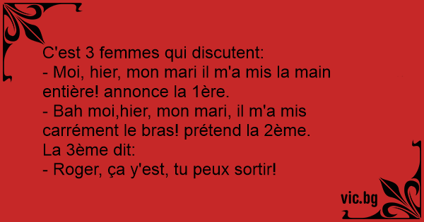 - Moi, hier, mon mari il m'a mis la main entière! annonce la 1ère.