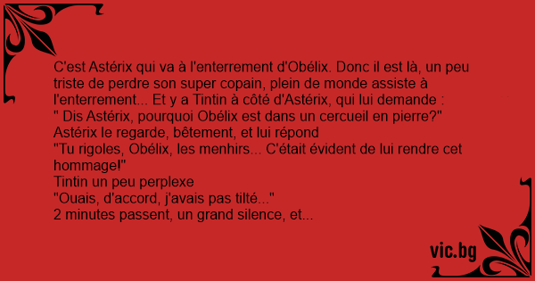 C'est Astérix qui va à l'enterrement d'Obélix. Donc il est là, un peu triste de perdre son super copain, plein de monde assiste à l'enterrement... Et y a Tintin à côté d'Astérix, qui lui demande :