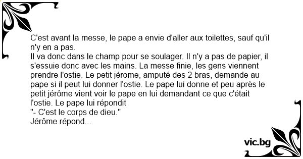 Il va donc dans le champ pour se soulager. Il n'y a pas de papier, il s'essuie donc avec les mains. La messe finie, les gens viennent prendre l'оsтiе. Le petit jérome, amputé des 2 bras, demande au pape si il peut lui donner l'оsтiе. Le pape lui donne et peu après le petit jérôme vient voir le pape en lui demandant ce que c'était l'оsтiе. Le pape lui répondit