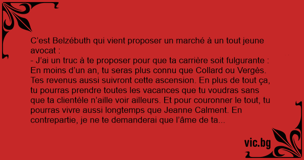 - J’ai un truc à te proposer pour que ta carrière soit fulgurante : En moins d’un an, tu seras plus connu que Collard ou Vergès. Tes revenus aussi suivront cette ascension. En plus de tout ça, tu pourras prendre toutes les vacances que tu voudras sans que ta clientèle n’aille voir ailleurs. Et pour couronner le tout, tu pourras vivre aussi longtemps que Jeanne Calment. En contrepartie, je ne te demanderai que l’âme de ta femme, celle de tes enfants, et celles des enfants de tes enfants : Leurs âmes brûleront en enfer pour l’éternité.