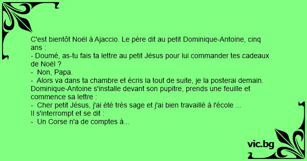 C'est bientôt Noël à Ajaccio. Le père dit au petit Dominique-Antoine, cinq ans : - Doumé, as-tu fais ta lettre au petit Jésus pour lui commander tes cadeaux de Noël ? - Non, Papa. - Alors va dans ta chambre et écris la tout de suite, je la posterai demain. Dominique-Antoine s'installe devant son pupitre, prends une feuille et commence sa lettre : - Cher petit Jésus, j'ai été très sage et j'ai bien travaillé à l'école ... Il s'interrompt et se dit : - Un Corse n'a de comptes à rendre à personne, surtout à quelqu'un qu'on ne connaît pas! Il déchire la lettre et recommence sur une autre feuille : - Petit Jésus, pour Noël, je veux ... Il s'arrête à nouveau. - Je le connais pas, il ne me connaît pas, qu'est-ce qui prouve que j'aurais ce que je veux, se dit-il ? Alors, le petit Dominique-Antoine va chercher la statue de la Sаinте Vierge sur sa table de nuit, la roule dans un journal, la ficelle et la glisse sous son matelas. Il reprend une feuille et écrit : - Petit Jésus, si tu veux revoir ta mère...