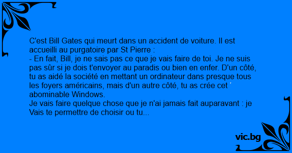 C'est Bill Gates qui meurt dans un accident de voiture. Il est accueilli au purgatoire par St Pierre :