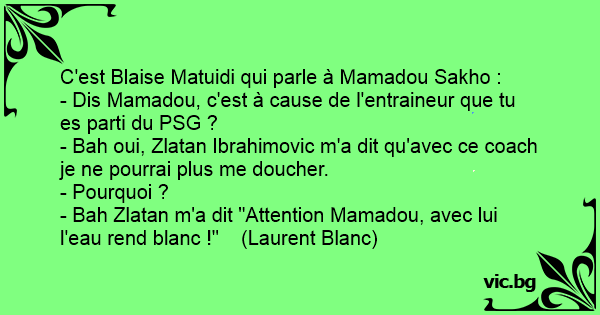 - Bah Zlatan m'a dit "Attention Mamadou, avec lui l'eau rend blanc !" (Laurent Blanc)
