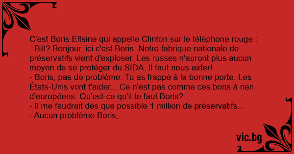- Bill? Bonjour, ici c'est Boris. Notre fabrique nationale de préservatifs vient d'exploser. Les russes n'auront plus aucun moyen de se protéger du SIDA. Il faut nous aider!