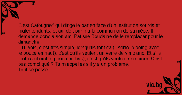 C’est Cafougnet’ qui dirige le bar en face d’un institut de sourds et malentendants, et qui doit partir a la communion de sa nièce. Il demande donc a son ami Patisse Boudaine de le remplacer pour le dimanche.
