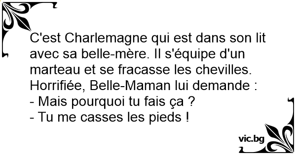C'est Charlemagne qui est dans son lit avec sa belle-mère. Il s'équipe d'un marteau et se fracasse les chevilles. Horrifiée, Belle-Maman lui demande :