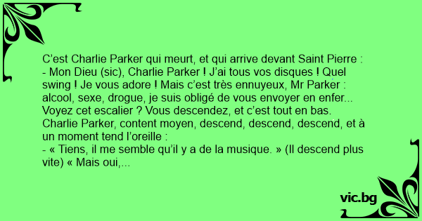 - Mon Dieu (sic), Charlie Parker ! J’ai tous vos disques ! Quel swing ! Je vous adore ! Mais c’est très ennuyeux, Mr Parker : alcool, sexe, drogue, je suis obligé de vous envoyer en enfer... Voyez cet escalier ? Vous descendez, et c’est tout en bas.