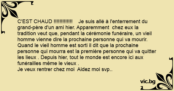 C'EST CHAUD !!!!!!!!!!!!! Je suis allé à l'enterrement du grand-père d'un ami hier. Apparemment chez eux la tradition veut que, pendant la cérémonie funéraire, un vieil homme vienne dire la prochaine personne qui va mourir. Quand le vieil homme est sorti il dit que la prochaine personne qui mourra est la première personne qui va quitter les lieux . Depuis hier, tout le monde est encore ici aux funérailles même le vieux .
