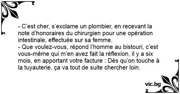 - Que voulez-vous, répond l’homme au bistouri, c’est vous-même qui m’en avez fait la réflexion, il y a six mois, en apportant votre facture : Dès qu’on touche à la tuyauterie, ça va tout de suite chercher lоin.