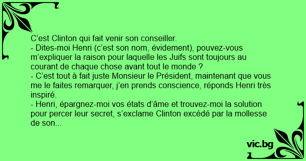 - Dites-moi Henri (c’est son nom, évidement), pouvez-vous m’expliquer la raison pour laquelle les Juifs sont toujours au courant de chaque chose avant tout le monde ?