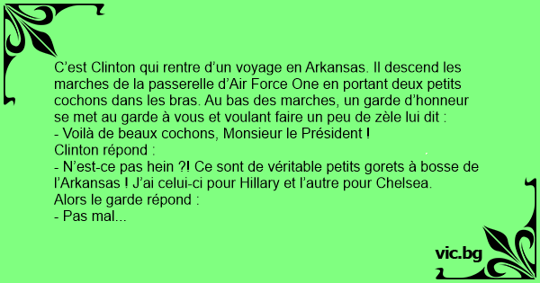 C’est Clinton qui rentre d’un voyage en Arkansas. Il descend les marches de la passerelle d’Air Force One en portant deux petits cochons dans les bras. Au bas des marches, un garde d’honneur se met au garde à vous et voulant faire un peu de zèle lui dit :
