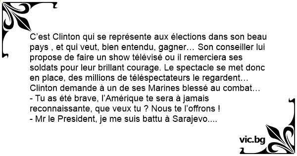 - Mr le président, je suis un vétéran du Viet-Nam… J’ai été blessé là-bas… Comme mon collègue, depuis que je suis rentré, les filles me fuient… Je devrai moi aussi m’en passer toute ma vie… (Clinton s’inquiète..)J’aimerais, Mr le president que vous mettiez des billets de 100 dollars entre mon trou du cul et mes couilles…