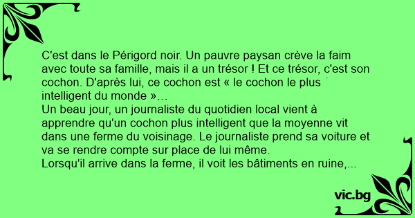 C'est dans le Périgord noir. Un pauvre paysan crève la faim avec toute sa famille, mais il a un trésor ! Et ce trésor, c'est son cochon. D'après lui, ce cochon est « le cochon le plus intelligent du monde »…