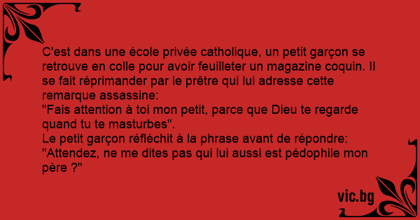 C'est dans une école privée catholique, un petit garçon se retrouve en colle pour avoir feuilleter un magazine coquin. Il se fait réprimander par le prêtre qui lui adresse cette remarque assassine: