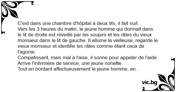 Vers les 3 heures du matin, le jeune homme qui dormait dans le lit de droite est réveillé par les soupirs et les râles du vieux monsieur dans le lit de gauche. Il allume la veilleuse, regarde le vieux monsieur et identifie les râles comme étant ceux de l'agonie.