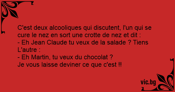 C'est deux alcooliques qui discutent, l'un qui se cure le nez en sort une сrотте de nez et dit :
