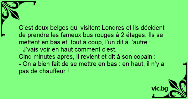 Deux belges visitent Londres pour la première fois. Ils montent dans un autobus rouge à impériale et s'installent au niveau inférieur. Quelques minutes plus tard, l'un deux dit : - Je vais monter...