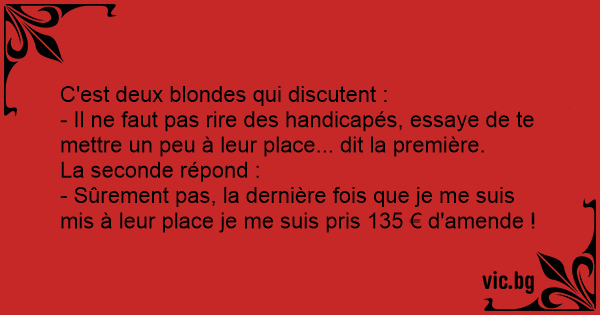 Две блондинки си говорят: - Не трябва да се смеем на хората с увреждания, опирай се да се поставиш на тяхно място... - По ско не, последният път, когато се поставих на тяхно място, ме глобиха със...