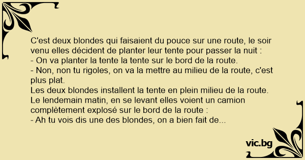 Les deux blondes installent la tente en plein milieu de la route. Le lendemain matin, en se levant elles voient un camion complètement explosé sur le bord de la route :