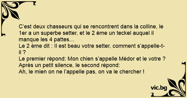 C’est deux chasseurs qui se rencontrent dans la colline, le 1er a un superbe setter, et le 2 ème un teckel auquel il manque les 4 pattes…