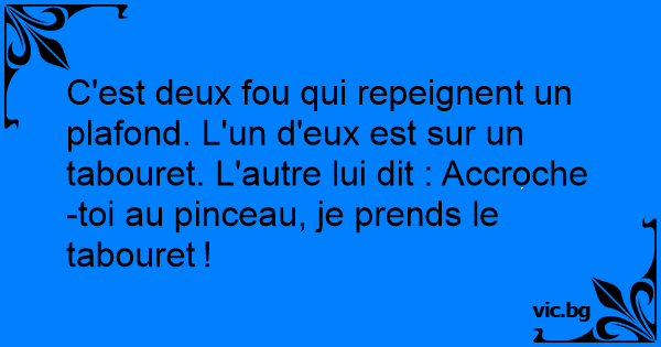 C'est deux fou qui repeignent un plafond. L'un d'eux est sur un tabouret. L'autre lui dit : Accroche-toi au pinceau, je prends le tabouret !
