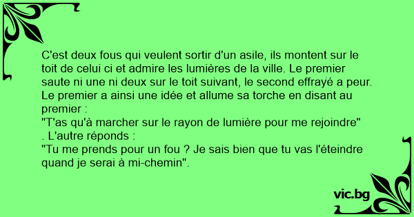 C'est deux fous qui veulent sortir d'un asile, ils montent sur le toit de celui ci et admire les lumières de la ville. Le premier saute ni une ni deux sur le toit suivant, le second effrayé a peur. Le premier a ainsi une idée et allume sa torche en disant au premier :