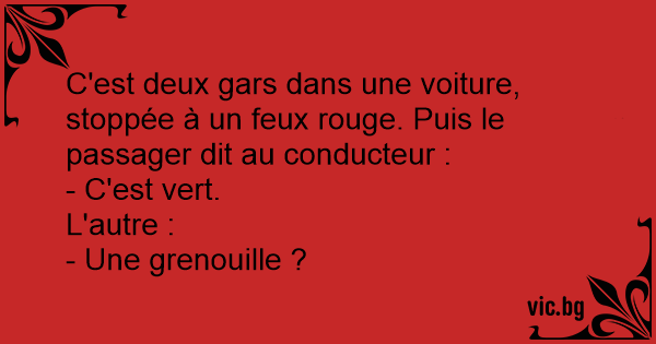 C'est deux gars dans une voiture, stoppée à un feux rouge. Puis le passager dit au conducteur :