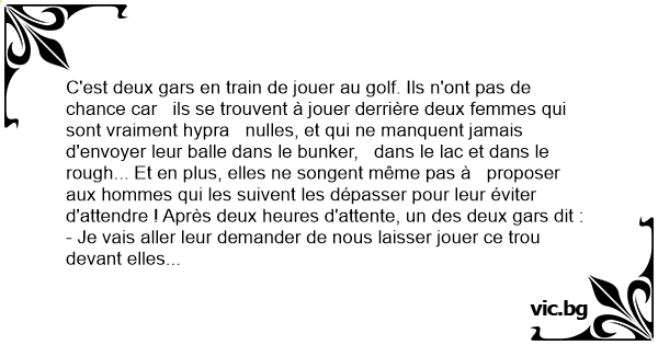 C'est deux gars en train de jouer au golf. Ils n'ont pas de chance car ils se trouvent à jouer derrière deux femmes qui sont vraiment hypra nulles, et qui ne manquent jamais d'envoyer leur ваllе dans le bunker, dans le lac et dans le rough... Et en plus, elles ne songent même pas à proposer aux hommes qui les suivent les dépasser pour leur éviter d'attendre ! Après deux heures d'attente, un des deux gars dit :
