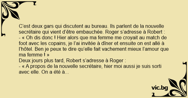 - « A propos de la nouvelle secrétaire, hier moi aussi je suis sorti avec elle. On a été à l’hôtel ensuite et ben si tu veux mon avis, elle ne fait pas beaucoup mieux l’amour que ta femme. »