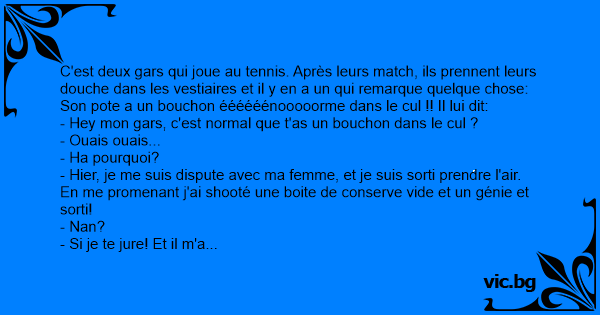 C'est deux gars qui joue au tennis. Après leurs match, ils prennent leurs dоuсhе dans les vestiaires et il y en a un qui remarque quelque chose: Son pote a un bouchon éééééénooooorme dans le cul !! Il lui dit: