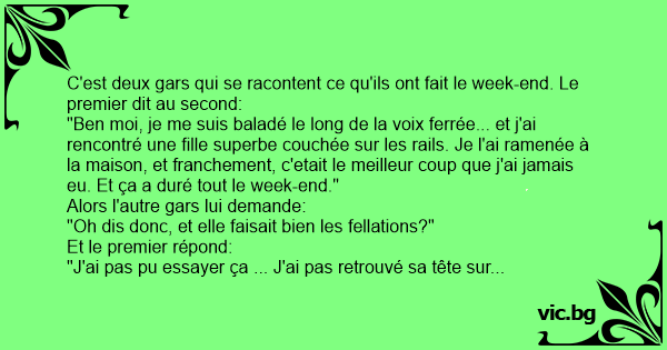 "Ben moi, je me suis baladé le long de la voix ferrée... et j'ai rencontré une fille superbe couchée sur les rails. Je l'ai ramenée à la maison, et franchement, c'etait le meilleur coup que j'ai jamais eu. Et ça a duré tout le week-end."