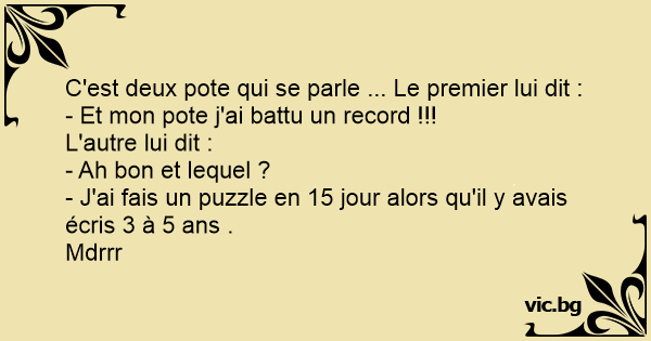 C'est deux pote qui se parle ... Le premier lui dit :<br />- Et mon pote j'ai battu un record !!!<br />L'autre lui dit :<br />- Ah bon et lequel ?<br />- J'ai fais un puzzle en 15 jour alors qu'il y avais écris 3 à 5 ans .<br />Mdrrr