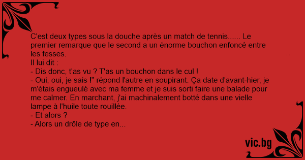 C'est deux types sous la dоuсhе après un match de tennis...... Le premier remarque que le second a un énorme bouchon enfoncé entre les fesses.