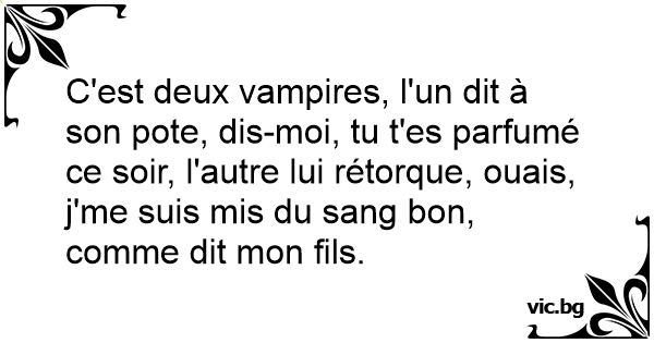 C'est deux vampires, l'un dit à son pote, dis-moi, tu t'es parfumé ce soir, l'autre lui rétorque, ouais, j'me suis mis du sang bon, comme dit mon fils.