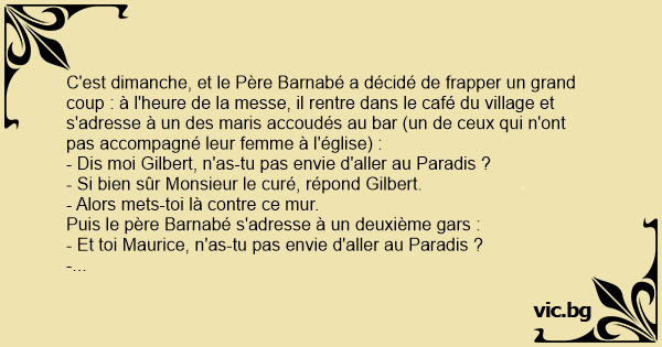 C'est dimanche, et le Père Barnabé a décidé de frapper un grand coup : à l'heure de la messe, il rentre dans le café du village et s'adresse à un des maris accoudés au bar (un de ceux qui n'ont pas accompagné leur femme à l'église) :