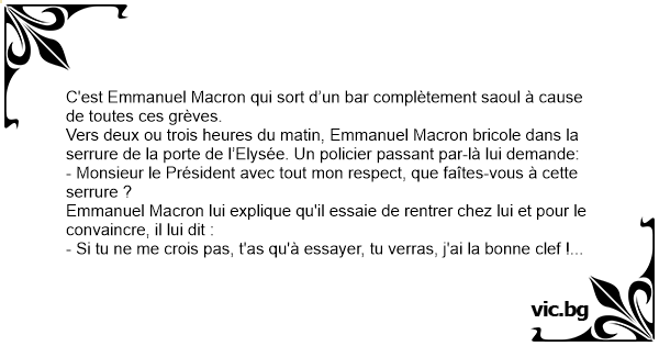Vers deux ou trois heures du matin, Emmanuel Macron bricole dans la serrure de la porte de l’Elysée. Un policier passant par-là lui demande: