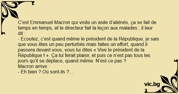 C’est Emmanuel Macron qui visite un asile d’aliénés, ça se fait de temps en temps, et le directeur fait la leçon aux malades ; il leur dit :