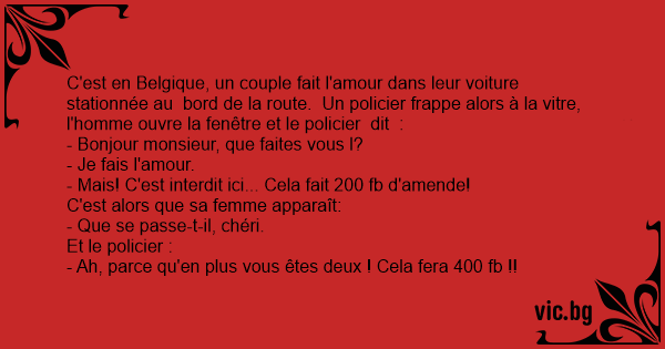 C'est en Belgique, un couple fait l'amour dans leur voiture stationnée au bord de la route. Un policier frappe alors à la vitre, l'homme ouvre la fenêtre et le policier dit :
