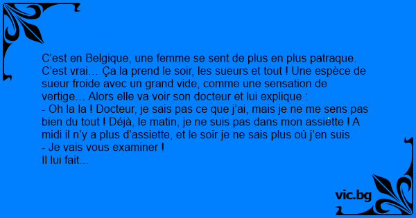 C’est en Belgique, une femme se sent de plus en plus patraque. C’est vrai… Ça la prend le soir, les sueurs et tout ! Une espèce de sueur froide avec un grand vide, comme une sensation de vertige… Alors elle va voir son docteur et lui explique :