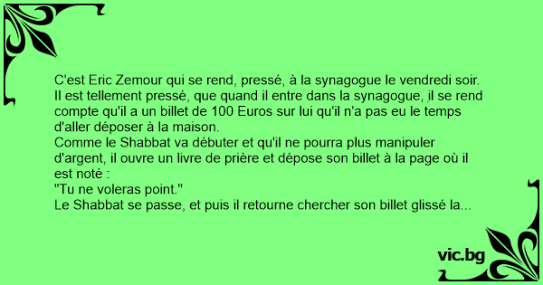 Il est tellement pressé, que quand il entre dans la synagogue, il se rend compte qu'il a un billet de 100 Euros sur lui qu'il n'a pas eu le temps d'aller déposer à la maison.