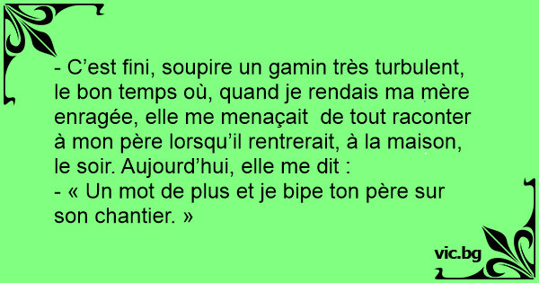 - C’est fini, soupire un gamin très turbulent, le bon temps où, quand je rendais ma mère enragée, elle me menaçait de tout raconter à mon père lorsqu’il rentrerait, à la maison, le soir. Aujourd’hui, elle me dit :