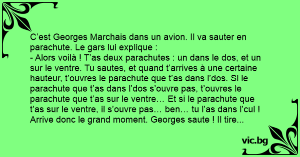 - Alors voilà ! T’as deux parachutes : un dans le dos, et un sur le ventre. Tu sautes, et quand t’arrives à une certaine hauteur, t’ouvres le parachute que t’as dans l’dos. Si le parachute que t’as dans l’dos s’ouvre pas, t’ouvres le parachute que t’as sur le ventre… Et si le parachute que t’as sur le ventre, il s’ouvre pas… ben… tu l’as dans l’cul !
